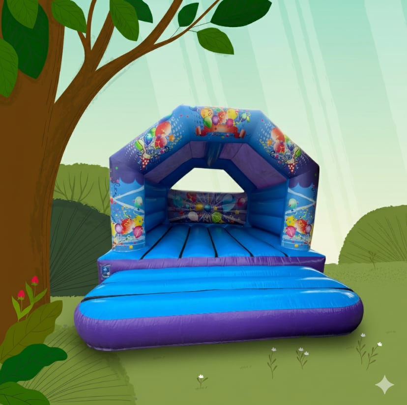 15ft x 12ft Blue and Purple Party Time — Bright, Safe Bouncy Castle Hire 🎉