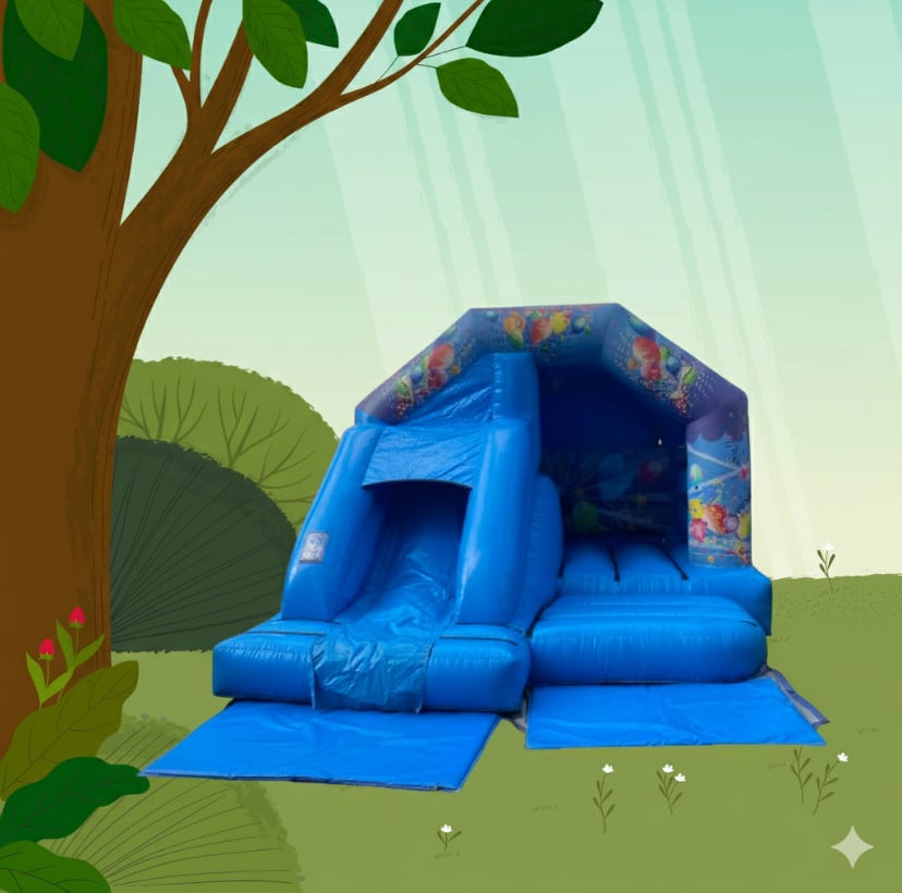 15ft x 12ft Blue Party Time Combi Bouncy Castle in Burton, Swadlincote, midway, Hartshorne, Linton, Rosliston, Newton Soleny, Repton, Willington, Hilton, Hatton, Tutbury, Derby, Mickleover, Littleover.