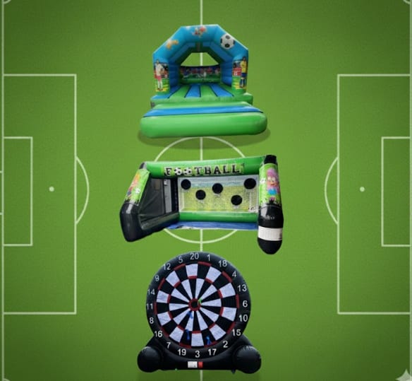 Turn any event into a football festival. Bouncy Castle, penalty shootout and inflatable football darts. Competitive. Safe. Memorable. Bouncy castle hire Football Package 2 in Burton, Derby, Barton, Tutbury, Alrewas, Hatton, Hilton, Newborough, Swadlincote, Repton, Church Gresley, Castle Gresley, Linton, and Meesham